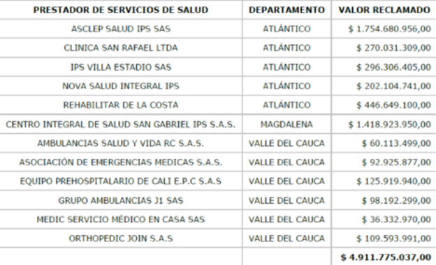 De estas 23 IPS, la ADRES suspendió el reconocimiento y pago de reclamaciones a 12 que radicaron más de $4.911 millones. Estas entidades venían facturando con anterioridad y son las siguientes.